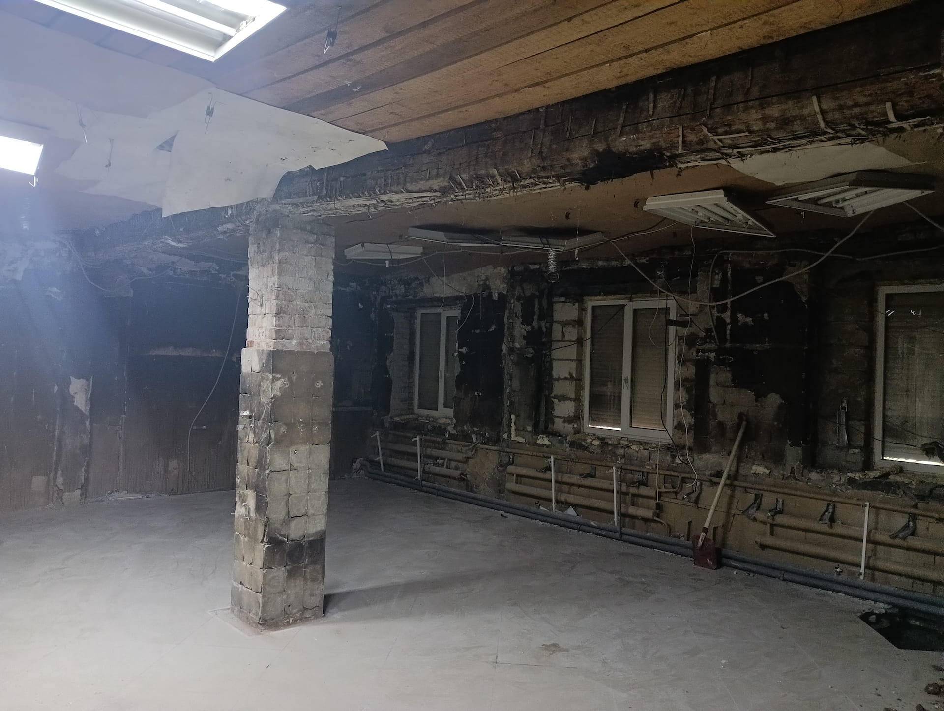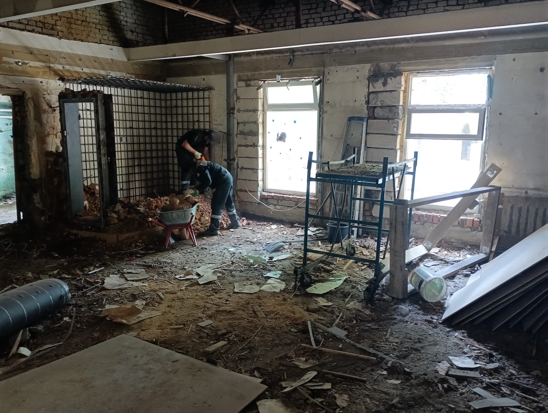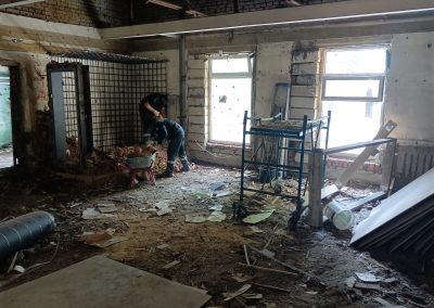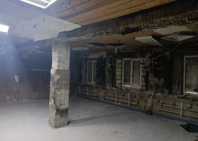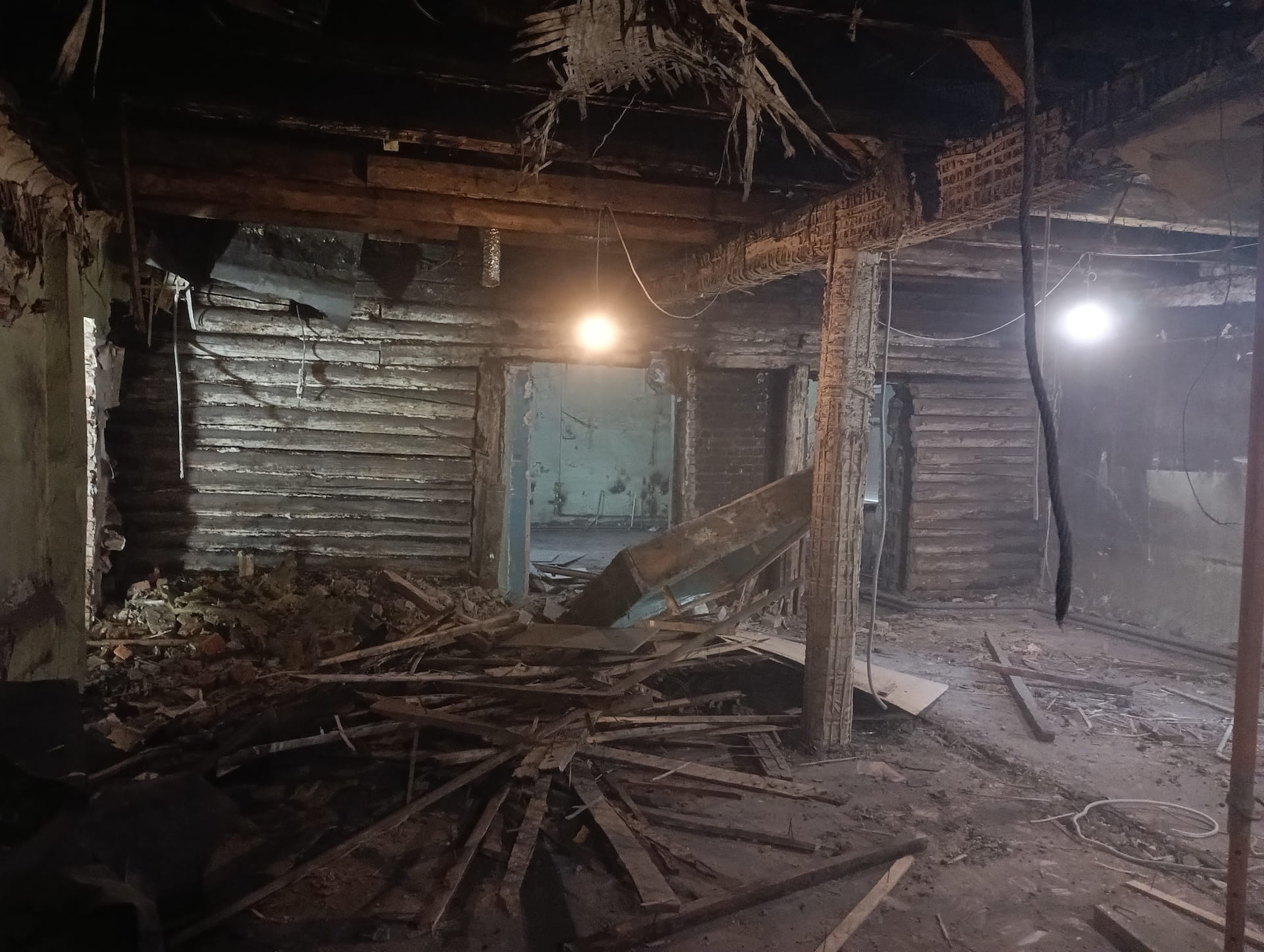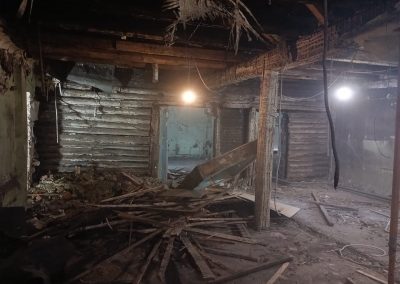 В ходе внутренних демонтажных работ выявилась полная потеря несущей способности — разрушение затронуло внешние стены и кровлю. Для предотвращения обрушения в оперативном порядке был разработан дополнительный том рабочей документации и смонтирован временный металлокаркас, стабилизировавший здание.