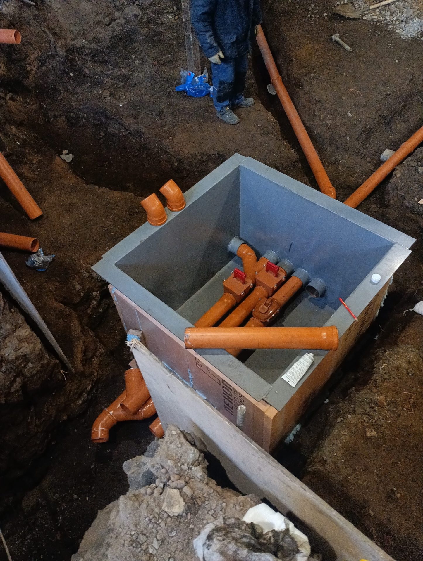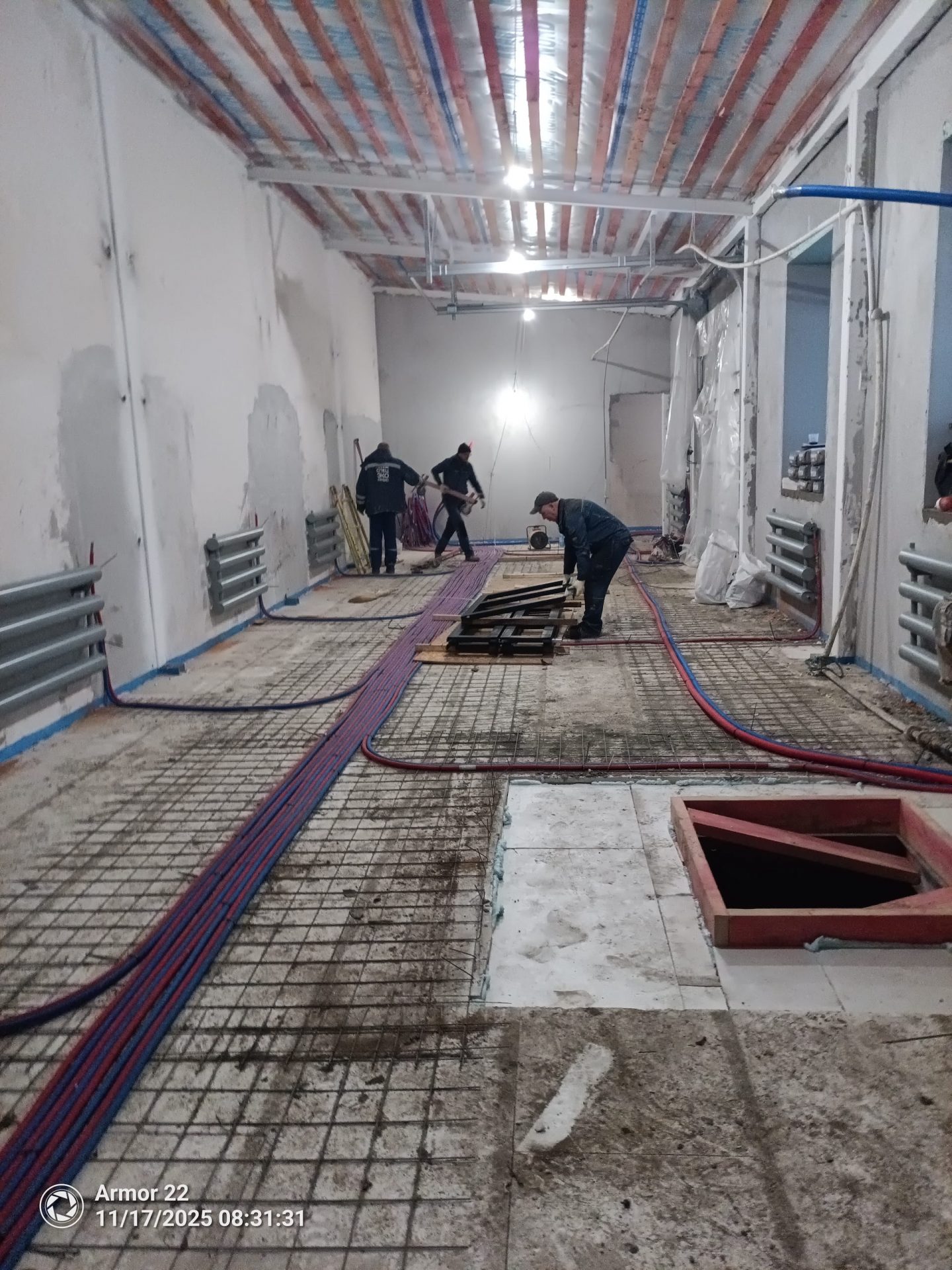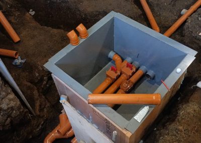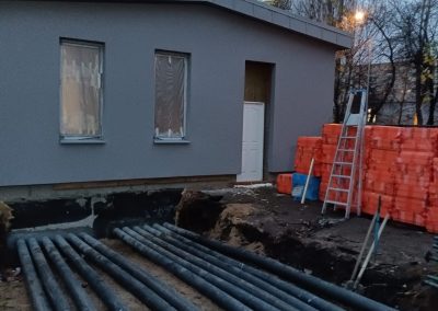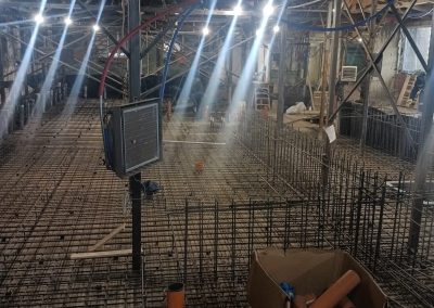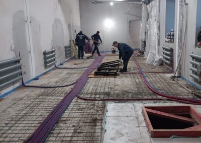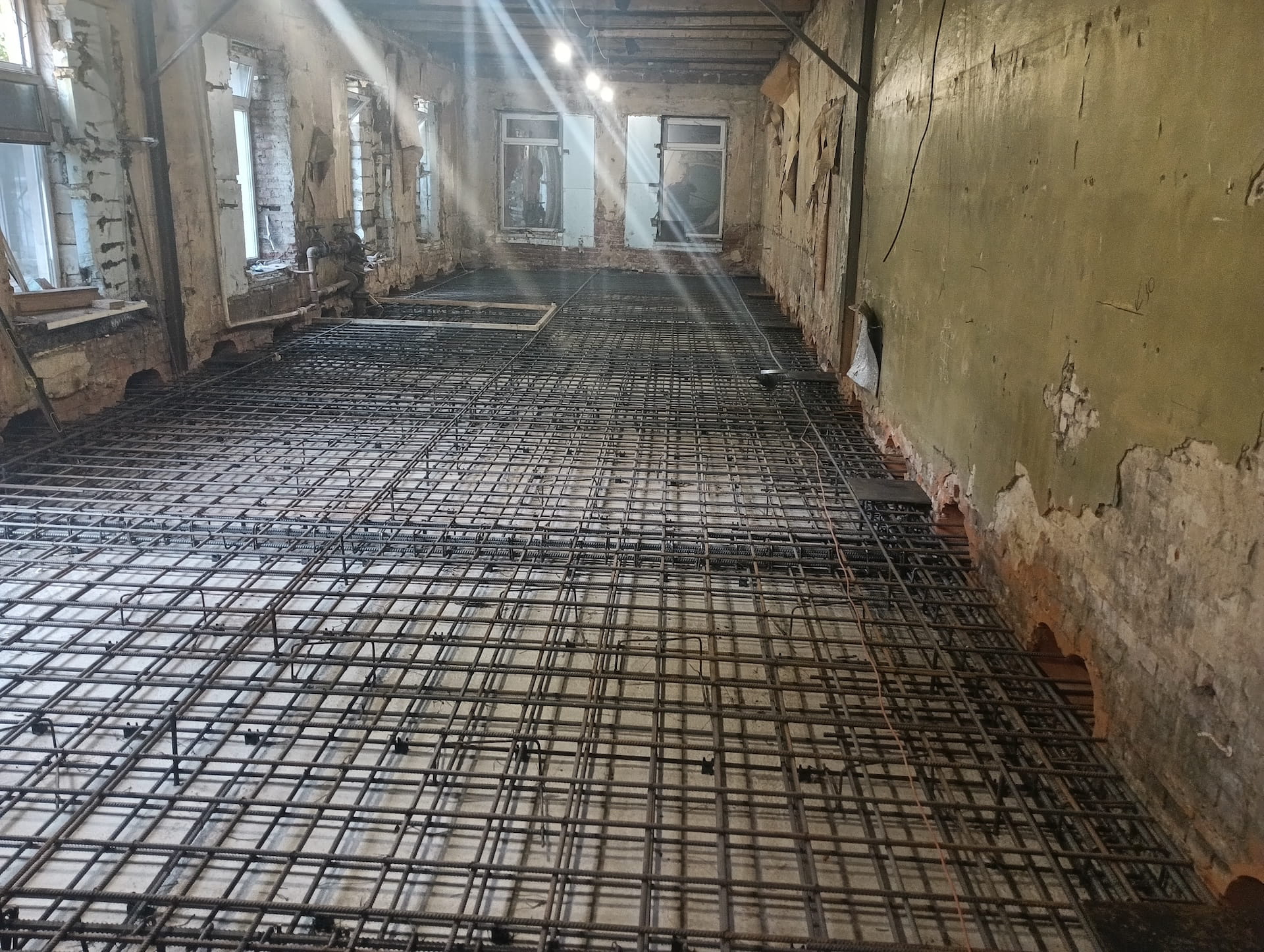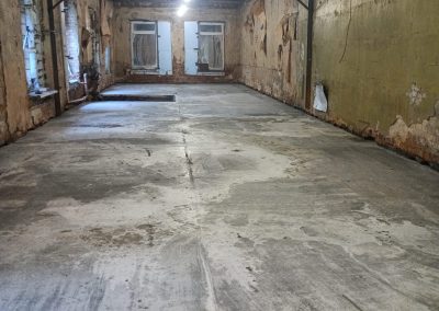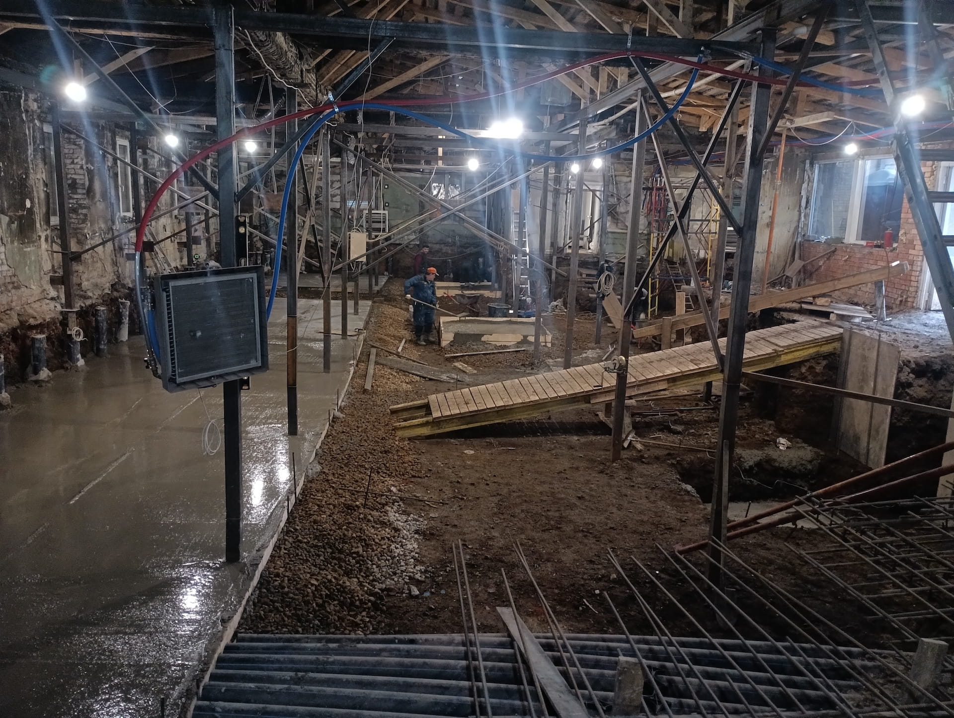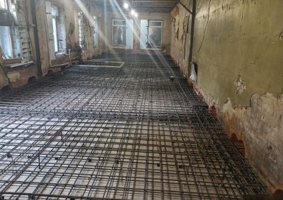 Под всей площадью здания выполнена разработка грунта для понижения уровня чистого пола и устройства новой монолитной плиты основания. Параллельно проводилось инъектирование фундаментов — нагнетание специальных составов под давлением для заполнения трещин и пустот, восстановления целостности конструкций и обеспечения гидроизоляции.