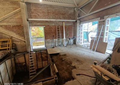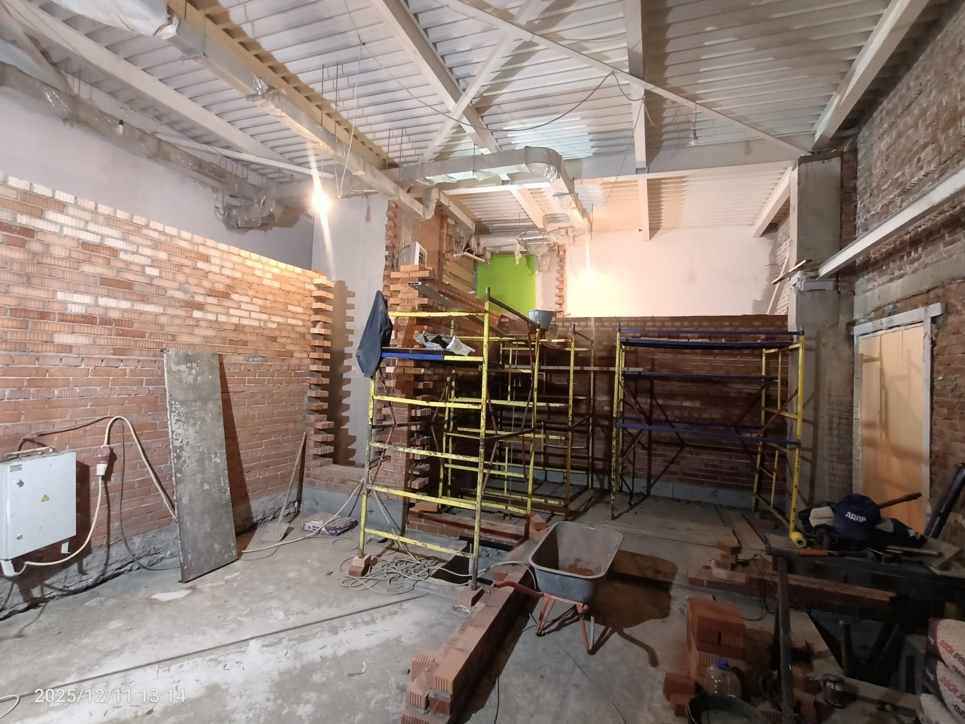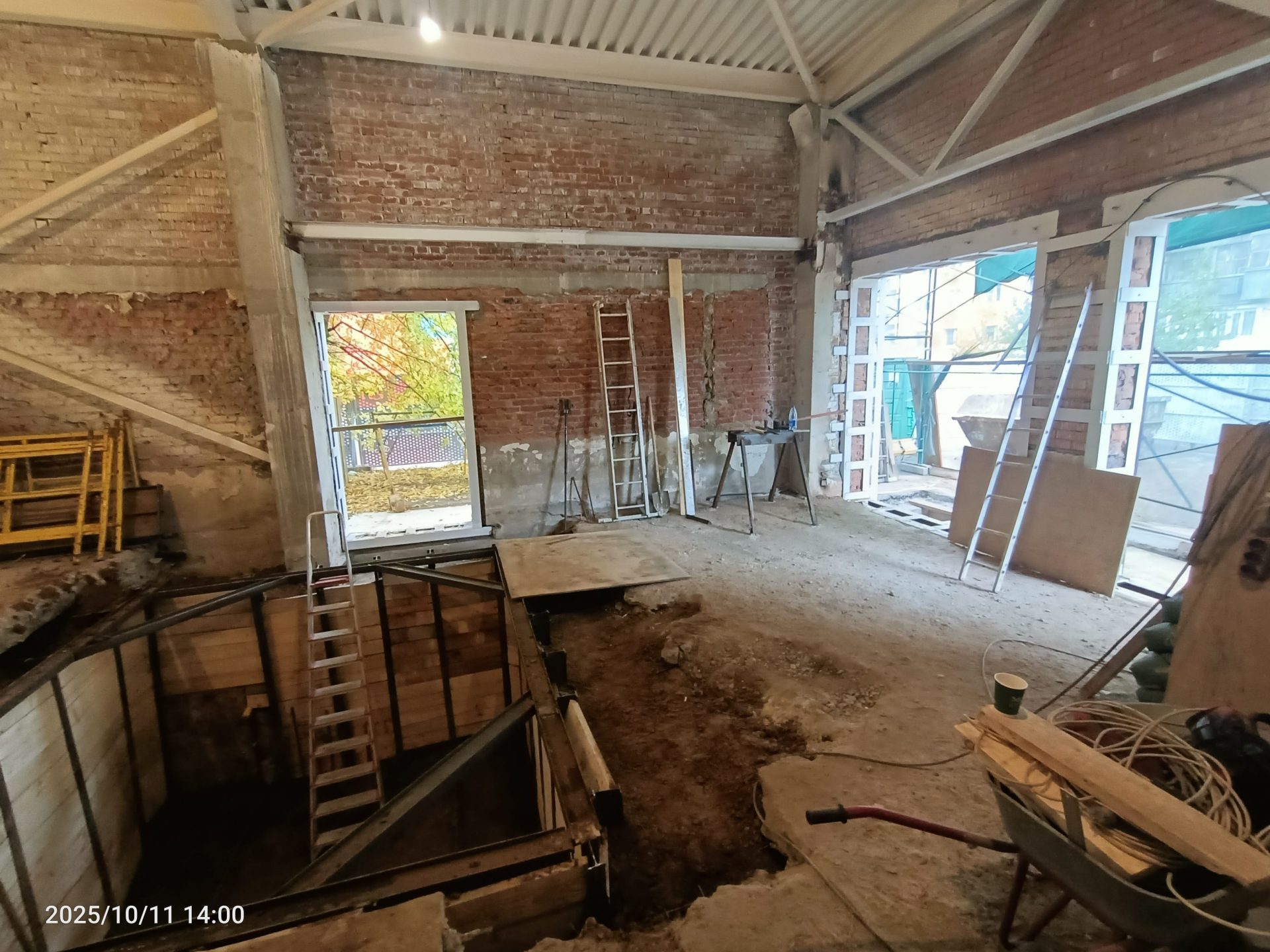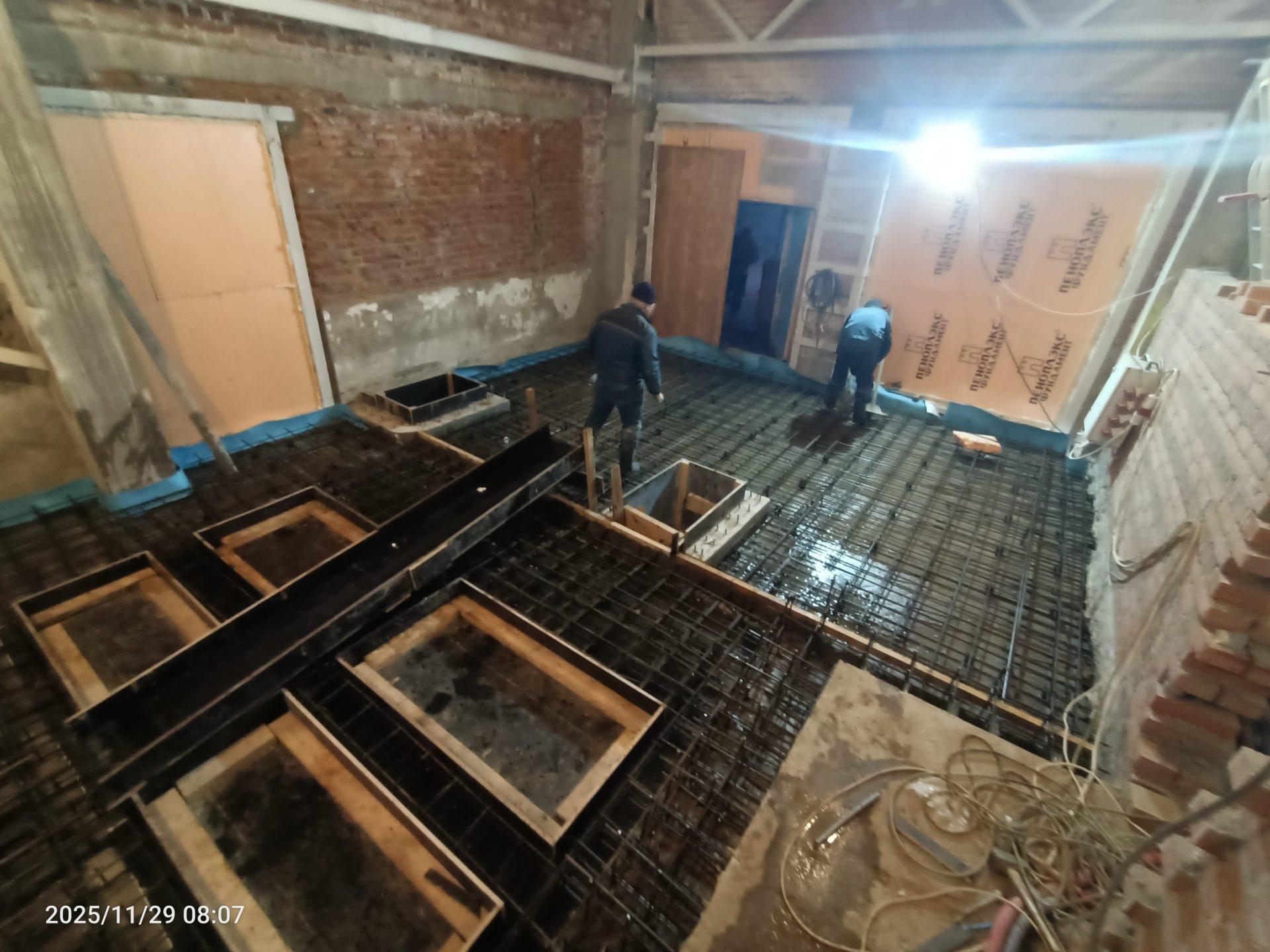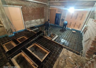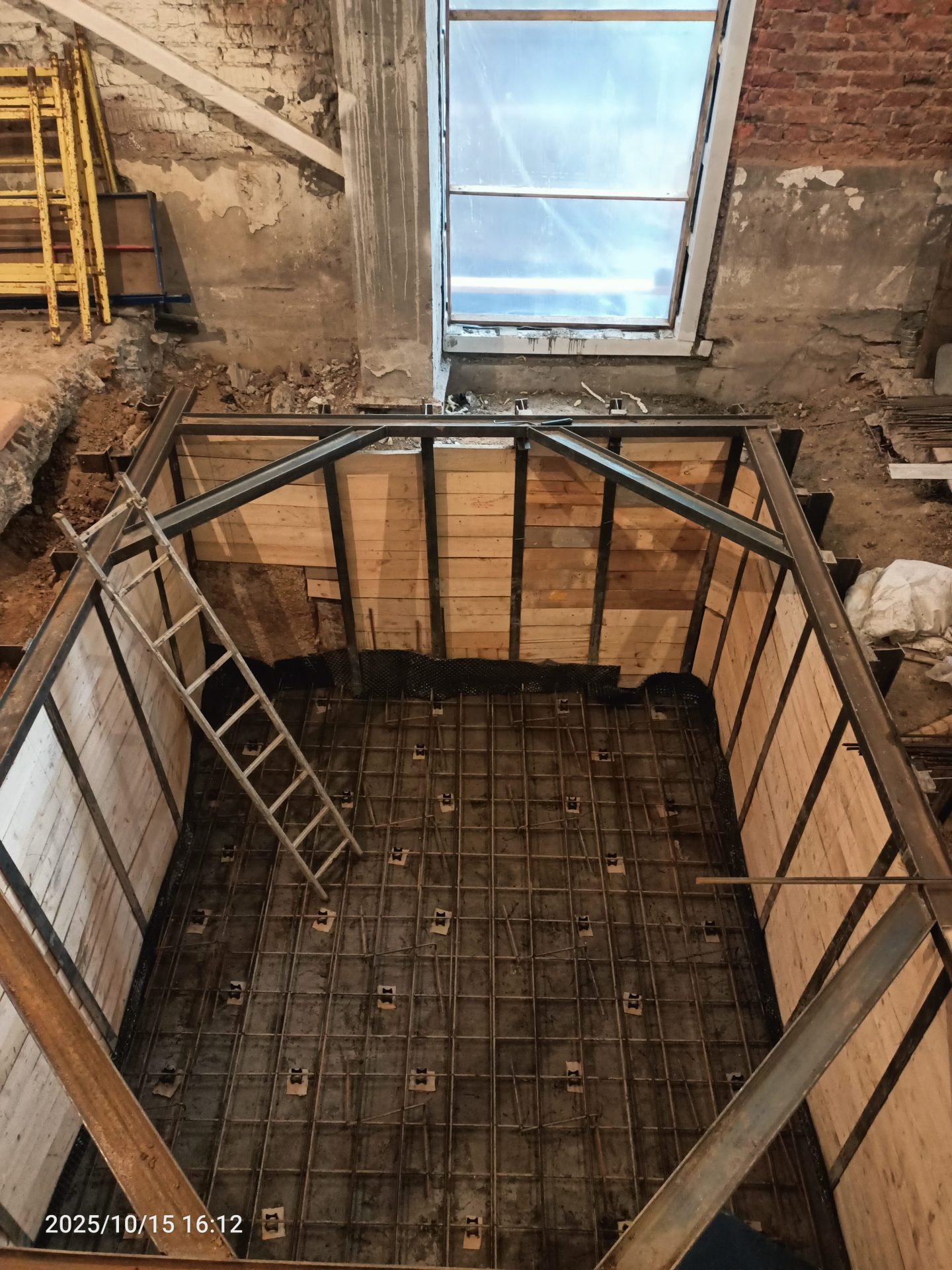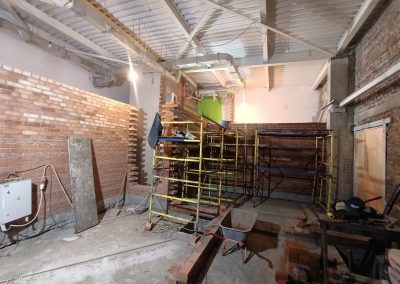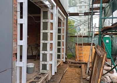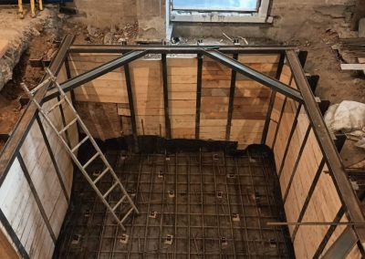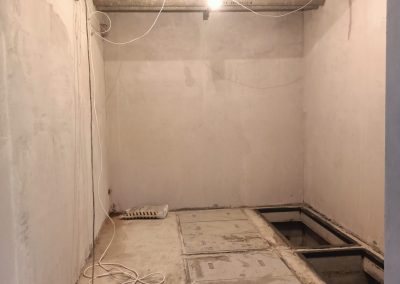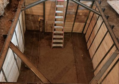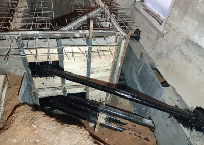 Согласно рабочей документации, под трансформаторную подстанцию требовался технический этаж ниже уровня существующих полов. Для этого выполнили шпунтовое ограждение и разработку котлована, понизили уровень чистого пола и залили новую монолитную плиту основания. После этого были возведены стены и кровля подстанции.